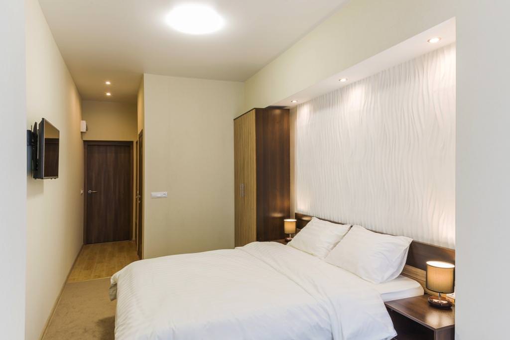 Комфортный двухместный однокомнатный номер, оформленный в теплых тонах, с размещением на одной двуспальной кровати.